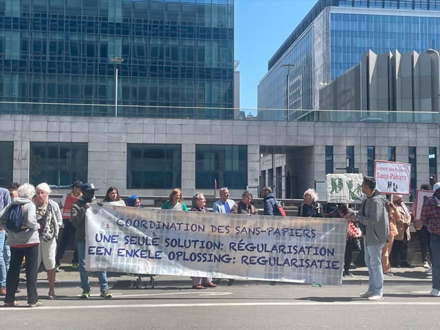 Başkent Brüksel'deki Yabancılar Ofisi'nin önünde bir araya gelen göstericiler, "Tek çözüm: yasal statü vermek" , "Hiçbir insan yasa dışı değildir", "Kağıtsızlarla dayanışma içindeyiz" yazılı pankartlar açtı.